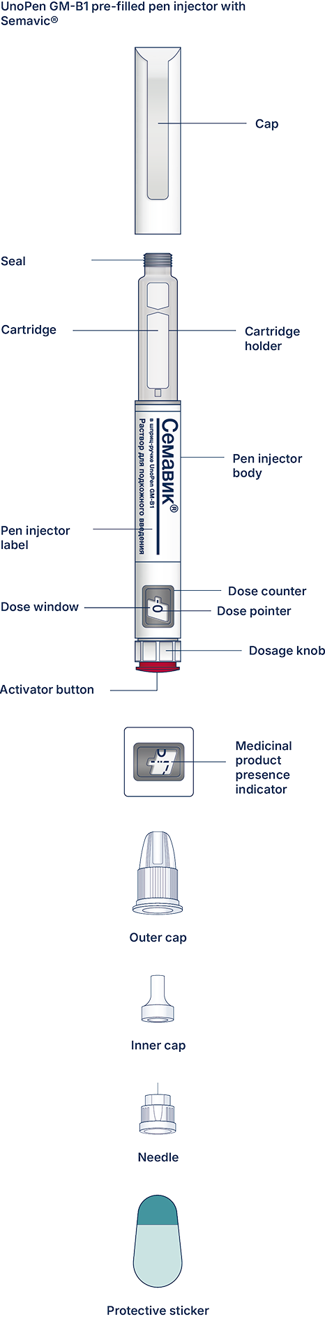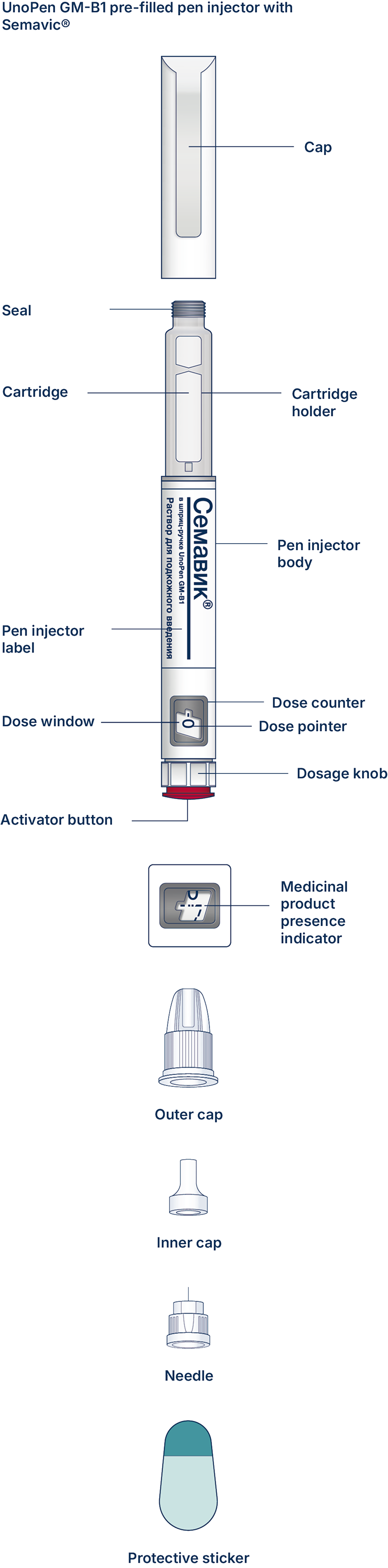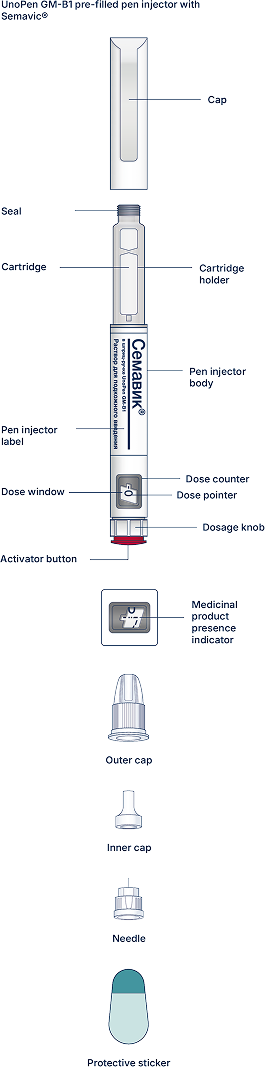 UnoPen GM-B1 pen injector is a pre-filled disposable pen injector for multiple injections (“pen injector”) with semaglutide, an antidiabetic drug, glucagon-like peptide-1 (GLP-1) analogue Semavic® (0.25 mg/dose, 0.5 mg/dose, 1.0 mg/dose), solution for subcutaneous injection in a pre-filled pen injector for delivery of the doses of 0.25 mg, 0.5 mg, and 1.0 mg. The pen injector is designed to titrate a dose of 0.25 mg and maintain a therapeutic dose of 0.5 mg and 1.0 mg. One pen injector contains 3 mL of the solution.